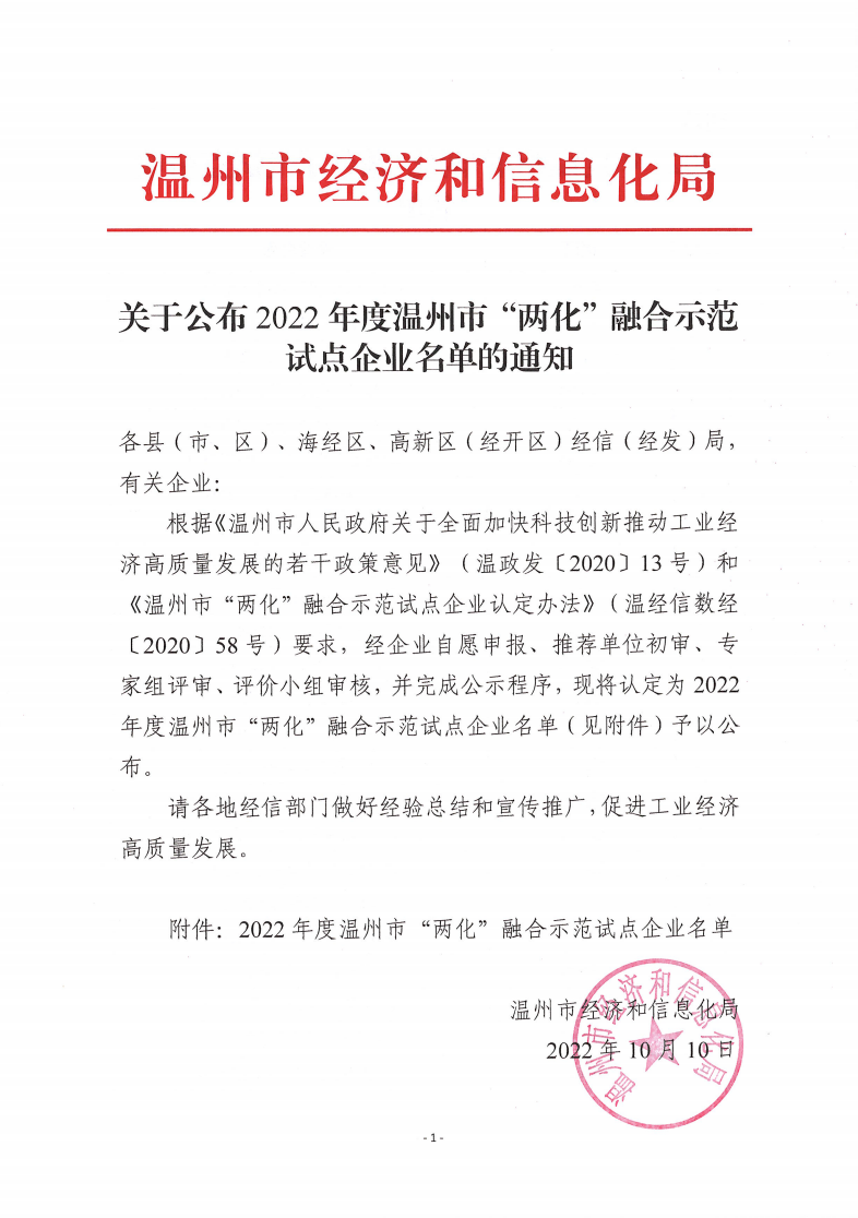 關于公布2022年度溫州市“兩化”融合示范試點企業名單的通知